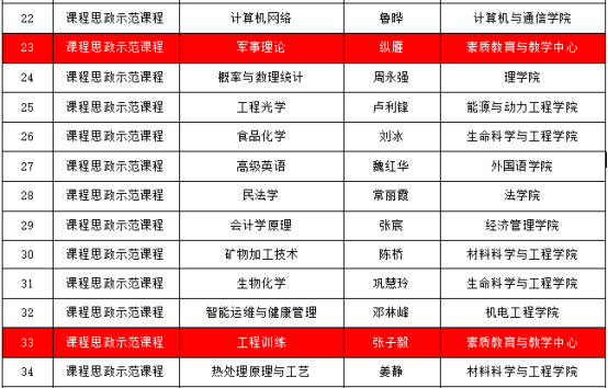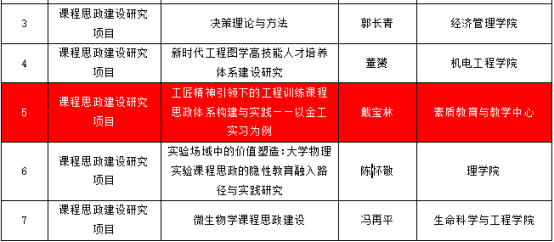 7月9日,学校教务处发《关于公布 2025 年课程思政示范项目立项建设名单的通知》中,素质中心张子毅的“工程训练”、纵雁的“军事理论”、戴宝林的“工匠精神引领下的工程训练课程思政体系构建与实践——以金工实习为例”成功立项。
